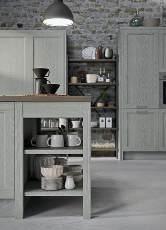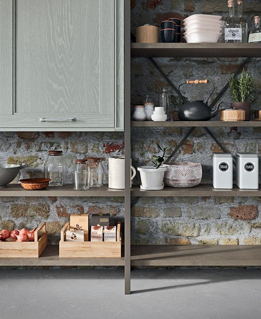 Le finiture classiche si accompagnano agli accessori della linea industrial, quali le vetrine con il vetro armato o la lavagna sovrascrivibile, lo zoccolo, il basamento metallico del tavolo e la maniglia squadrata Diana.