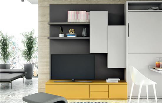 Parete living attrezzata con il modulo Zenith matrimoniale provvisto del tavolo da pranzo. Convivio capace di accogliere fino a quattro persone che scompare con l’apertura del letto. Il rivestimento boiserie a parete è munito di pensili verticali ad anta e moduli base con cassetti su cui collocare agevolmente tv e relative console.