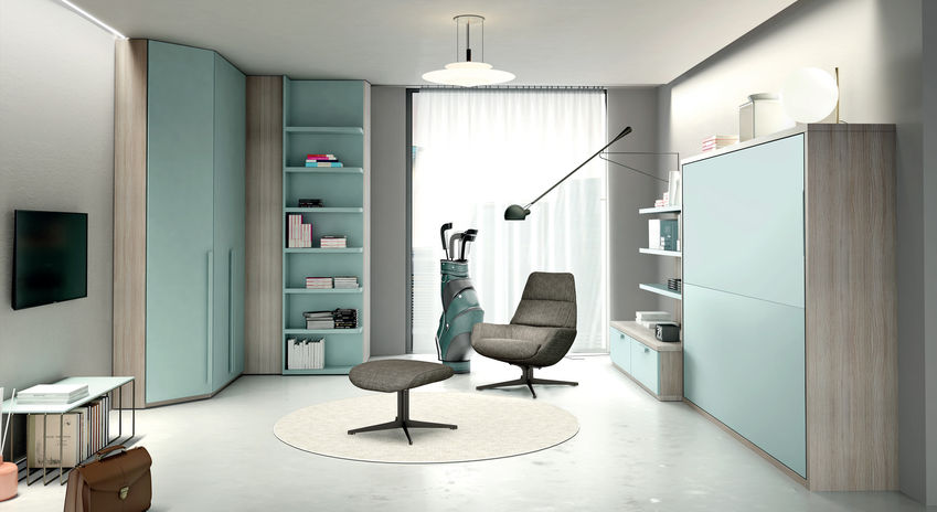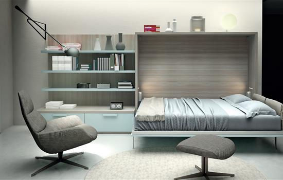 Cabina armadio Quadra abbinata ad armadio con elemento terminale che si raccorda armoniosamente con la parete. Il modulo letto Skyline matrimoniale ad apertura orizzontale risolvere le possibili ridotte dimensioni dello spazio fronte letto senza rinunciare alla massima comodità.