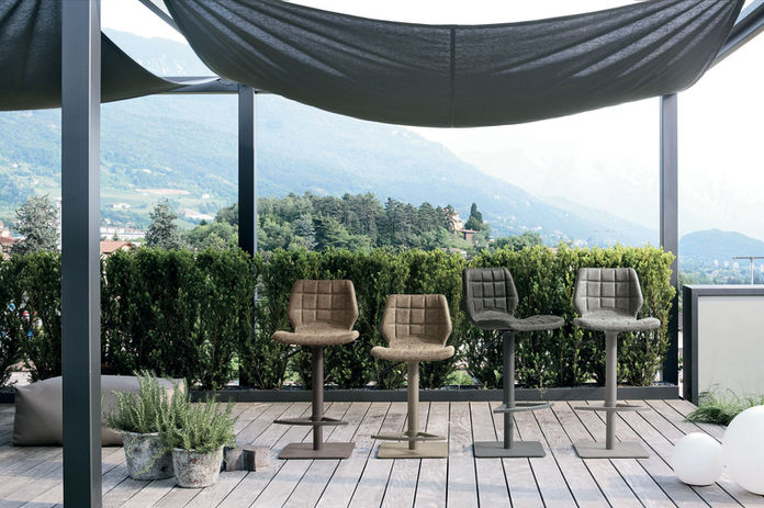 Sgabello regolabile in altezza – e per questo adatto sia per la cucina sia per il living – con basamento in metallo verniciato e seduta rivestita in morbida microfibra effetto velluto oppure in Soft-Touch Vintage.